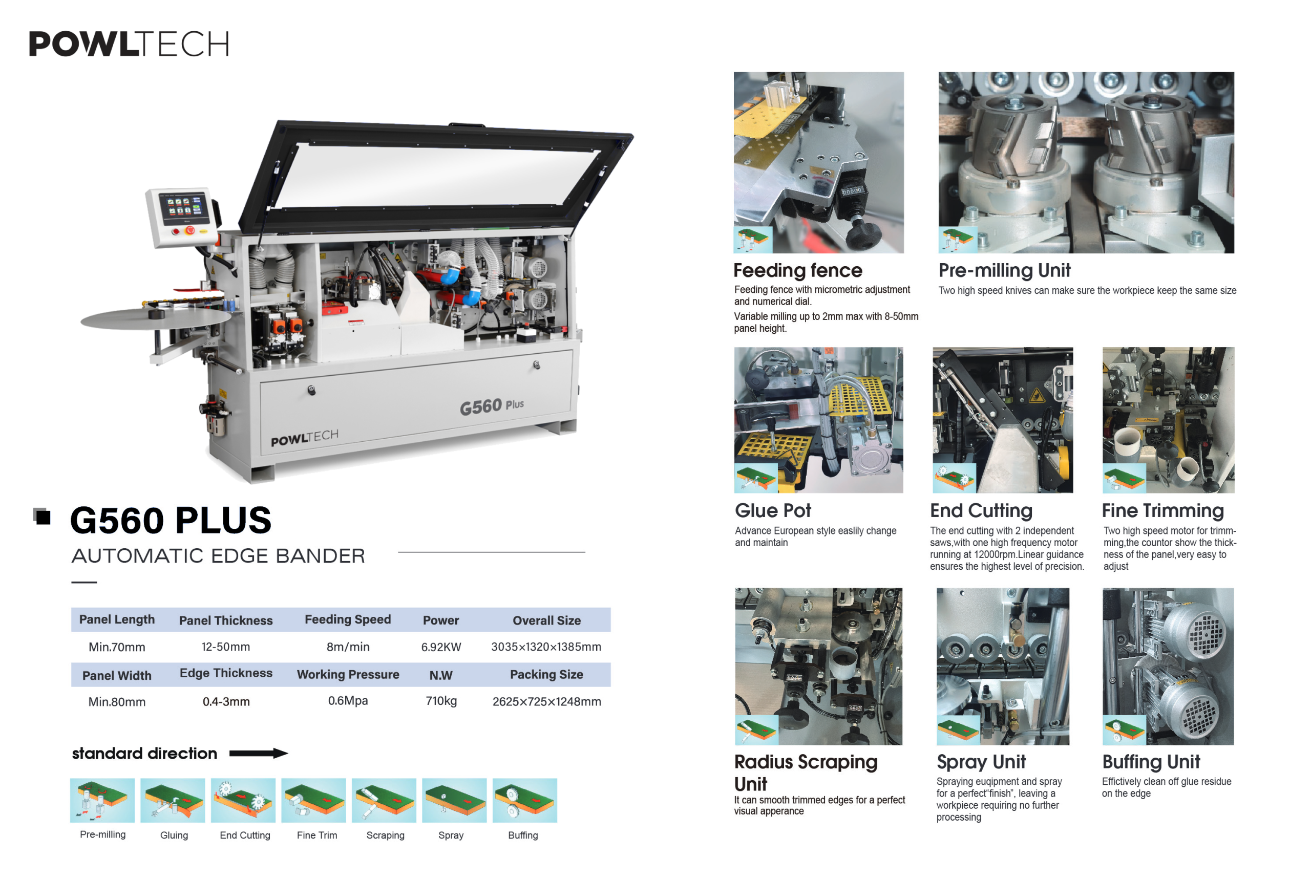 The PowlTech G560-Plus and G564-Plus represent a new generation of compact edge banding solutions designed for woodworking manufacturers seeking efficiency without sacrificing quality. Built on a remarkably small footprint, both machines deliver professional-grade performance for processing coiled edge material from 0.4-2mm thickness on workpieces up to 43mm thick—making them ideal for small to mid-sized production facilities with space constraints.